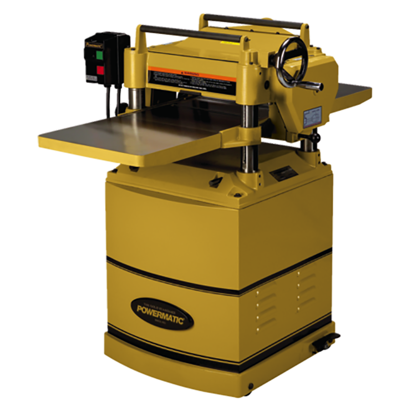 The helical cutterhead on this planer provides smoother cutting and a finer finish than conventional knives, and the 74 four-sided indexable carbide knife inserts do not require adjustment after installing. Three V-belts transfer maximum power from the 3HP motor to the cutterhead. Your workpiece will get substantial support from the precision ground cast iron table and two large extension wings. The 4″ dust port angles the collection hose away from the work area. Stock return rollers atop the machine speed repetitive cuts. The serrated steel infeed and smooth steel outfeed roller allow for 1/8″ maximum depth of cut and trouble-free operation. A 2-speed gearbox features an automatic chain tensioner. The one-piece welded steel stand has built-in lockable casters for easy movement around the shop.