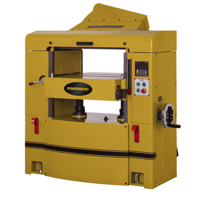 The POWERMATIC® WP2510 Planer has a solid steel helical cutterhead with four-sided carbide knife inserts that require no adjustments when changing. With a digital readout and simple PC controller, setting up table heights is quick and easy. The frame is machined from heavy cast iron and has extra wide side panels that offer rigid bed support and ensure accurate alignment. The planer’s segmented, serrated infeed roll with segmented chip breakers has an independent yield of 1/4. Its automatically adjusting, chain drive gear box powers the 3″ diameter infeed rollers, solid pressure bar and dual outfeed rollers for precise feeding of stock. The 3-speed feed selector gives woodworkers flexibility by changing feed rates quickly and easily. The WP2510 Planer has a large 32-3/16″ x 26″ precision-ground table which contains two adjustable table rollers for smooth feeding of uneven stock. The planer has a Quick-Set micro-adjustable lever that easily raises and lowers the table rollers from 0 to 0.05″. The hood features a built-in 5″ diameter dust chute.