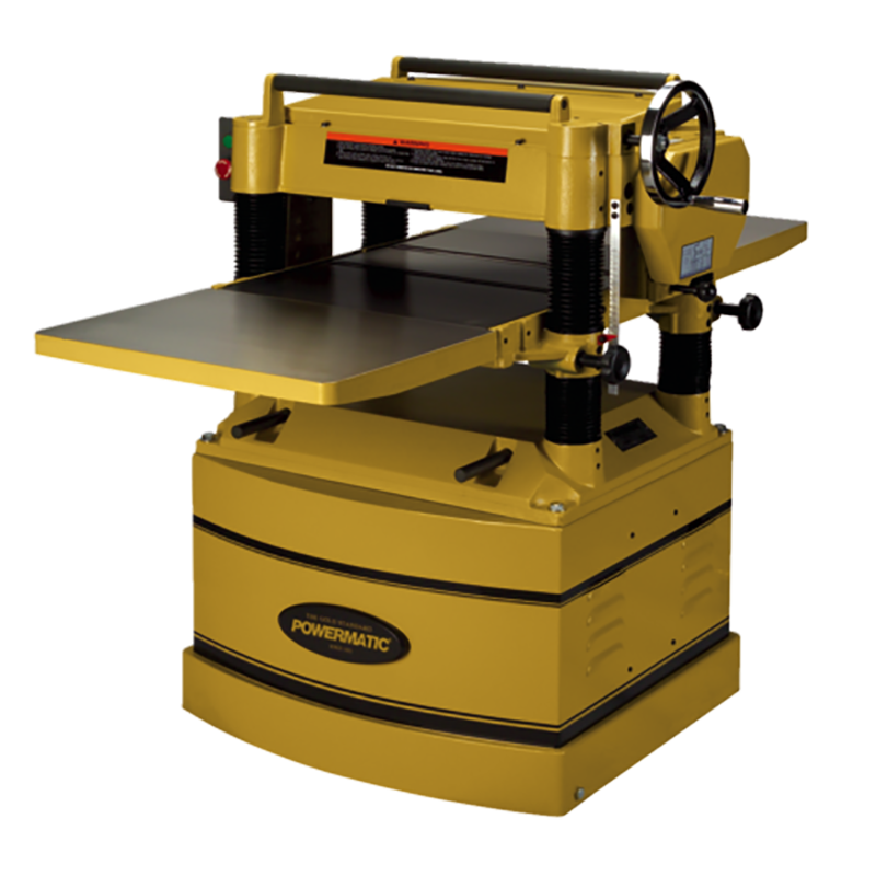 This heavy duty planer offers performance and value, loaded with standard features not found on other machines in its class. The powerful 5HP motor and 20″ planing capacity will handle the most demanding work. The helical cutterhead provides quieter operation and finer finishing than conventional systems, and the four-sided knife inserts seat themselves without requiring a set-up gauge. The 5″ dust port connects easily to any dust collector. The anti-kickback fingers and pressure bar are located in close proximity to the cutterhead for an exceptional finish. The solid cast iron base, table and head are designed for production. The 2-speed oil bath gearbox transmits full power to feed rollers and facilitates fast speed changes at 24 and 31 FPM. The gearbox can be changed to 4-speed with the included gear to run lower speeds of 16 and 20 FPM. The corrugated infeed and fine groove outfeed rollers ensure a smooth feed. The precision ground and polished cast iron table rides on four steel columns giving it plenty of support for the larger workpiece. Heavy cast iron extension wings ensure a flat, smooth cut.